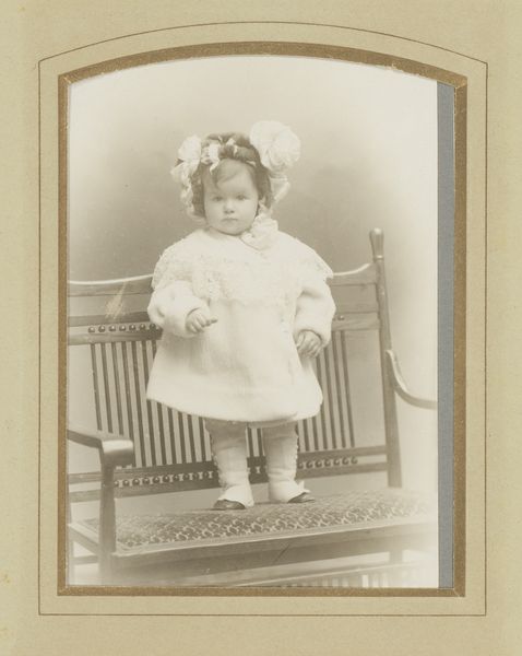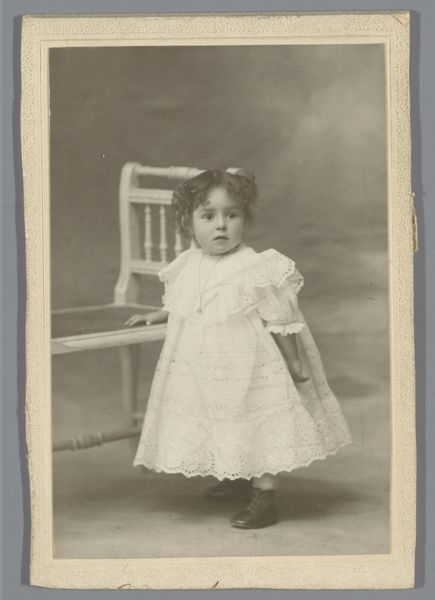 Curator: This photograph by Albert Alfred Warnery, titled “Portret van een onbekend meisje op een stoel,” dates back to sometime between 1873 and 1885. It presents a captivating glimpse into the late 19th century. Editor: The sepia tones lend such a delicate and innocent quality to this young girl's portrait. I’m struck by how timeless yet utterly specific to its era it feels. Curator: I'm particularly intrigued by the printing process itself. It looks like it may have undergone some restoration given the photo has signs of deterioration and handling with an almost dreamlike watercolour illustration quality. It’s crucial to consider the labor involved in producing and reproducing such images during that era. The socio-economic factors surrounding photography and who had access to it—it wasn’t a universal experience by any means. Editor: Absolutely. This image speaks volumes about childhood, representation, and the very construction of identity within specific class and gendered constraints. Look at her poised stance; is this simply how children were photographed or is this representative of the rigid Victorian standards for young women? This isn’t just a picture, it’s a document, layered with social context. We must acknowledge photography’s historical role in both reflecting and shaping societal norms and inequalities. Curator: Thinking about that constructed nature and her simple ruffled dress made with delicate textiles, points to the artistry and craft involved. Even mass-produced items still involved considerable hand labor. Also the little carved stool, or her socks; we can interpret that detail based on available source materials and extant garment examples and attempt to extrapolate details about everyday lives from a limited perspective. Editor: And doesn't it beg questions about this girl's future? About who she becomes? Does the act of recording this stage also shape it, solidifying the beginning of a prescribed life path? These seemingly still, innocent photographs can be so deceiving in their historical complexity. Curator: True. This portrait is an excellent reminder of the tangible processes behind image-making, especially within shifting social landscapes. Editor: For me, it becomes a moment to ponder not just representation but resilience and the enduring impact these kinds of images have on the shaping and understanding of histories and our place within it.