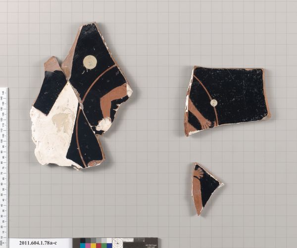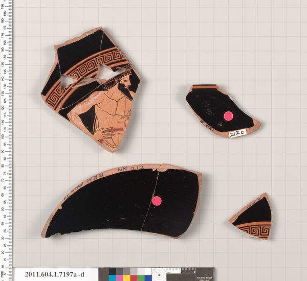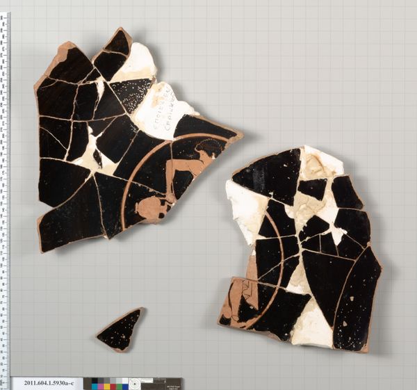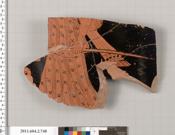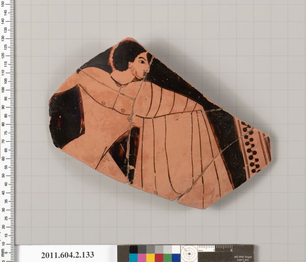 Editor: We're looking at a terracotta fragment from what was once a column-krater, a bowl for mixing wine and water. It dates back to 530 BC and is currently housed at the Metropolitan Museum of Art. The fragment has this beautiful reddish-orange hue contrasting with black figures, creating a powerful visual impact, despite its broken state. How do you interpret this work, particularly considering its historical context? Curator: This fragment speaks volumes, doesn't it? Look beyond just the image; think about its function. This wasn't simply decoration; the krater itself, used for communal drinking, was central to ancient Greek social and political life. Who was participating in these symposia? Who was excluded? The imagery depicted, now fragmented, likely offered narratives reinforcing societal norms. What stories do you think this scene, with its partial figures and geometric patterns, might have been trying to tell, and for whom? Editor: I hadn’t thought about the social dynamics tied to the object itself, just the figures. The fragment makes me consider the untold parts of the story, who is missing. Curator: Exactly! And consider the materiality: Terracotta itself signifies accessibility, compared to more precious materials. How might the democratization of art-making and ownership—even back then—challenge or reinforce existing power structures? Think about the role of craft versus 'high art.' Editor: So even a broken piece of pottery offers a lens into ancient social structures and power dynamics. It’s amazing to think of art not just as aesthetic, but deeply embedded in cultural and political contexts. Curator: Precisely! The act of examining art like this lets us reconstruct possible narratives. Art becomes an act of social archaeology.