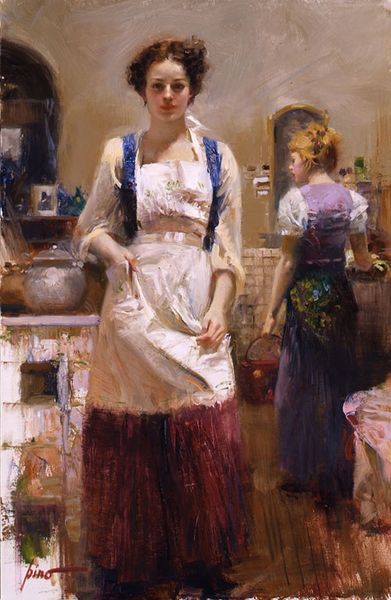 Editor: So, this is Isaac Israels' "In the Café," painted in 1905. It's an oil painting of a woman at a table. The impressionistic brushstrokes give it a very immediate, almost voyeuristic feel. What strikes you most about this piece? Curator: Immediately, I'm drawn to consider the role of women in public spaces during this period. Genre paintings like this provide valuable insights into the evolving social landscape and the changing status of women. Look at the cafe: it is presented as a stage for observing modern life. Editor: A stage? Could you elaborate on that? Curator: Certainly. Israels, like many Impressionists, was fascinated by the dynamics of modern urban life. Cafes, historically male spaces, became more accessible to women as they gained greater social freedom, which in turn shaped how society at large behaved. Who gets to be *seen* and under what conditions were key to the larger narrative. Does the woman's gaze suggest she is aware of being observed? Editor: That's an interesting point. She is looking down, rather detached, almost as though in her own world. Curator: Precisely! Consider the art nouveau influences visible here: how the floral elements are a nod to feminine sensibilities, yet juxtaposed with the reality of her limited agency within the urban landscape. Do you think that duality reinforces or subverts traditional gender roles? Editor: I hadn't thought of it that way, but now I see how the painting exists in that tension. I learned about the social impact on subjecthood and spatial ownership; fascinating! Curator: And I gained insights into appreciating the complexities of portraiture through your keen eye.