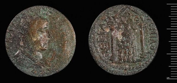 Curator: This is a bronze coin from Amphipolis, issued during the reign of Emperor Valerian I. Editor: It's fascinating to see how time has transformed it; the verdigris patina gives it an almost otherworldly quality. Curator: Coins like this were not just currency; they served as propaganda, circulating the emperor's image and messages throughout the empire. Editor: Absolutely, the iconography becomes a powerful tool for shaping public perception, reinforcing imperial authority. This coin is a direct link to the political and social structures of the time. Curator: It's a tangible reminder of the economic and political networks that tied the Roman Empire together. Editor: Looking at this object, I think about labor conditions and resource extraction, about who had access to power and who was excluded. Curator: It encourages us to consider the legacies of empires and the social dynamics embedded within them. Editor: Exactly! It's a fragment of history, inviting us to contemplate its impact on the present.