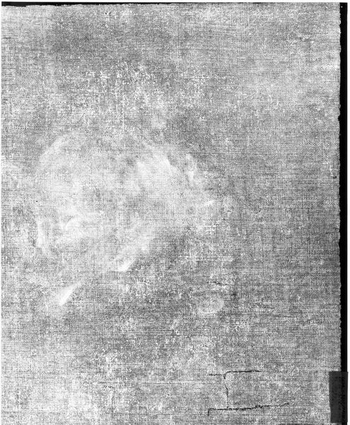 Curator: We're looking at an X-radiograph related to Ralph Earl's painting, "British Marching into Concord." It's an image produced using X-rays to reveal the painting's internal structure. Editor: Immediately striking is the ghostly, almost spectral quality. It evokes a sense of hidden layers and unseen narratives. The varying densities create an abstract composition. Curator: Exactly. X-radiography allows us to see alterations or pentimenti made by the artist, revealing his creative process. These changes hold cultural memory of the artistic decisions. Editor: The stark contrast and textures also highlight the materiality of the canvas and paint, drawing attention to its physical construction. It’s like a map of the artist's actions. Curator: Indeed, it provides a window into the artist's mind, showing not just the final image but also the evolution of the artwork and its symbolic weight. Editor: It's a compelling reminder that every artwork is a palimpsest, layered with meaning and material history. I find its ambiguity fascinating.
