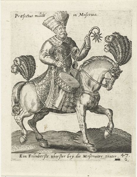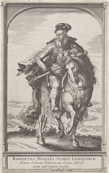 Abraham de Bruyn created this engraving, titled "Ierse ruiter," sometime in the late 16th century. The composition immediately strikes us with its dynamism. The rearing horse and rider are set against a stark, neutral background, emphasizing their forms. The lines are meticulously etched, creating texture and depth that draw the eye. The engraving depicts an Irish horseman, or "ruiter," in a style that is both detailed and idealized. De Bruyn's use of line work here isn't merely descriptive, it’s evocative. Note how the texture of the horse's coat contrasts with the rider's flowing cape. This opposition creates a sense of movement and drama. The formal elements here suggest more than just a portrait. They create a representation steeped in the cultural codes of the time, reflecting early European views of Irish identity. The visual presentation asks us to consider how such images shaped perceptions and contributed to larger discourses about cultural difference during this period. What do the choices of attire and weaponry signify? And how might they destabilize or reinforce contemporary values?