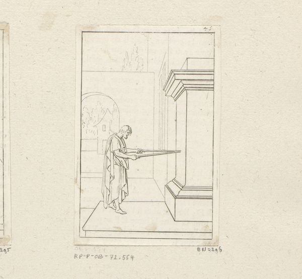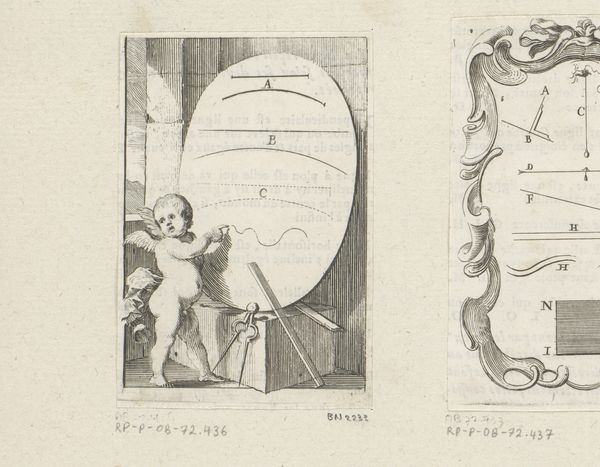 Curator: The artwork we’re looking at, dating back to 1679, is by Sébastien Leclerc I. It’s titled "Man markeert op ruit het punt waar hij een object ziet door de ruit heen", housed here at the Rijksmuseum. Editor: My initial response is one of cool detachment. The subdued line work and analytical subject creates distance, doesn’t it? The monochrome amplifies this detached feeling, as does the geometrical drawing on the upper register of the artwork. Curator: Indeed. Leclerc’s process involved engraving and printing. Given his background, the print would have likely been fairly accessible, widely disseminated among artists to reproduce at different scales, playing a pedagogical role by distributing knowledge of geometrical techniques that served production within other social crafts. Editor: Focus, therefore, is clearly drawn to the geometry of sight, with those sharply defined lines bisecting planes, creating vanishing points to which the viewer's eye is helplessly led. Look at the clean rendition of perspective demonstrated in both planes. It has all the crisp logic of Euclid, doesn’t it? Curator: Yes, and we have to also consider the labor that went into creating and then teaching these geometrical formulas, and who it excluded, from women to non-Europeans who didn’t adopt these specific linear drawing techniques in artistic or scientific practice. The man represented drawing on the surface is actively shaping how future individuals will perceive depth and distance in representational projects to come. Editor: Absolutely, the intersection of the theory and practice gives this engraving a lasting presence. Its bare simplicity lets that foundational work of defining an artistic perspective shine through with remarkable efficacy. Curator: Looking closer at the print again makes me ponder the implications behind the scientific knowledge we take for granted and whose labor went into solidifying it, the politics and implications behind techniques such as perspective that have come to define our vision. Editor: Agreed. And in contemplating its lines, shapes and perspectives, the Leclerc has encouraged me to think further, considering its design, structure and materiality afresh.