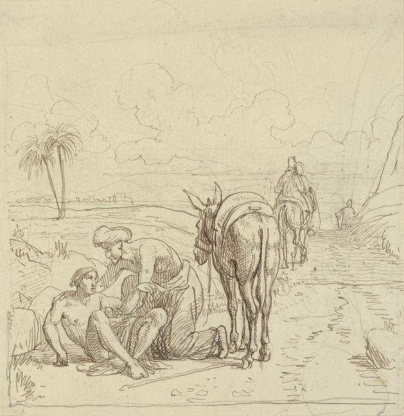 Wilhelm Marstrand rendered this ink drawing, titled 'The Good Samaritan Accompanies the Wounded Man,' sometime in the 19th century. The central motif, a man aiding another atop a donkey, carries echoes of ancient virtue. Consider how such a scene pervades cultural memory, reminiscent of Christ's entry into Jerusalem – a symbol of compassion and humble service. Yet, the Samaritan is not a king, but a figure of social marginality, one who transcends prejudice to act humanely. The act of lifting, of burden-sharing, appears throughout art history. It conjures images of Aeneas carrying his father from Troy, or even classical depictions of filial piety. These echoes form a chain reaction, a living testament to the enduring human need for empathy. Here, Marstrand taps into something primal: the shared, subconscious desire for aid, for rescue. The symbol of the Good Samaritan persists, resurfacing in our collective consciousness. This resonates beyond mere religious instruction; it speaks to the very core of what it means to be human, continually prompting introspection and action across time.
