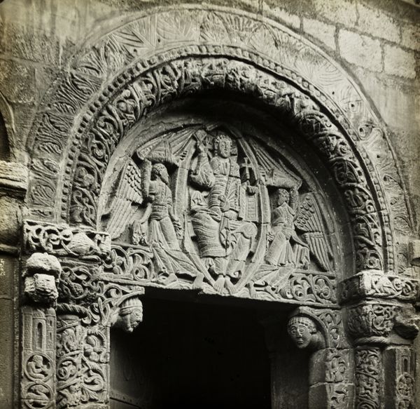 This photograph by Frederick H. Evans captures the side details of the Prior's Door at Ely Cathedral. Evans was a master of platinum printing, a photographic process prized for its smooth tonal range and archival quality. Look closely and you'll see that the image portrays intricate carvings in stone: floral motifs, interwoven vines, and figures within circular frames. Consider the labor involved in creating such detailed work. Each element meticulously carved by skilled stonemasons, who would've undertaken years of apprenticeship. The weight and texture of the stone itself, shaped with chisels and gouges, speaks of the human effort invested in its transformation. This image invites us to reflect on the value of craftsmanship, and the social context in which skilled labor and design converge. In understanding these aspects, we can appreciate the full cultural significance and historical value of such an artwork.