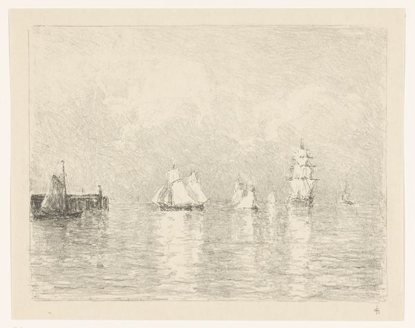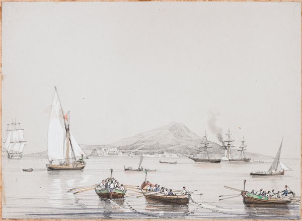 Editor: So, this is "View Inchkeith and the Firth of Forth Islands from Granton," made with graphite and gouache on paper in 1844. It has such a subdued and tranquil feel. What strikes you most about this piece? Curator: The interplay of horizontal and vertical lines immediately commands attention. Note how the artist uses the vertical masts of the boats to disrupt the expansive horizontality of the sea and sky. This interplay creates a visual rhythm. How do you perceive the artist's manipulation of space? Editor: Well, there seems to be a recession into the distance with progressively smaller ships, suggesting depth, but it also feels somewhat flattened, perhaps by the limited color palette. Curator: Precisely. The subdued palette contributes to a flattening effect, reducing the contrast and emphasizing the surface qualities of the work. Examine the composition closely; what shapes define the clouds and water, and how do they interact? Editor: I see mainly amorphous shapes, lots of curves and soft edges, except for the sharp lines of the ship masts cutting through. Curator: Notice how those linear elements create visual tension with the amorphous forms, preventing the composition from becoming too passive. The application of gouache and graphite on paper creates varied textures. What effect do you believe this was intended to produce? Editor: It gives the scene a misty quality, especially where the light reflects off the water. The roughness of the paper adds depth that makes it seem more three-dimensional. Curator: An astute observation. By controlling line, shape, texture, and composition, the artist constructs an interesting dialogue between Romanticism and emerging formalist values. I learned something here today. Editor: Me too. Looking beyond just the subject matter really changed how I saw this work.