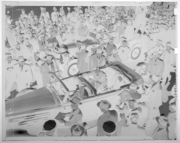 Editor: This photograph, simply titled "Untitled (old wrecked car)" by Lucian and Mary Brown, captures precisely that. The monochrome palette lends an eerie stillness. What do you make of its public presentation? Curator: Considering the socio-political context, especially with no clear date, it speaks volumes about consumerism and waste. The wrecked car, juxtaposed with advertisements, highlights the fleeting nature of material goods and the constant cycle of obsolescence that is perpetuated by advertising. Does that change your initial impression? Editor: It does, the placement next to ads gives it a much stronger message about cultural attitudes. Thank you! Curator: Absolutely! It's fascinating how context shapes meaning, isn't it?