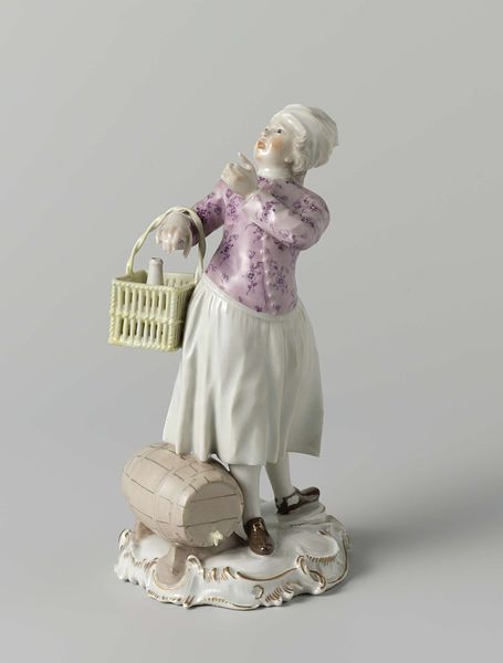 Curator: Here we have an earthenware figure, “Flower Seller,” crafted between 1740 and 1755, now residing at the Metropolitan Museum of Art. Isn't it lovely? Editor: Yes, the figure possesses a quaintness with a hint of underlying artificiality. She is presenting flowers that appear less natural than constructed, decorative almost. Curator: These kinds of porcelain figures really exploded in popularity amongst the bourgeoisie during that period, part of a wider culture of collecting small, ornate objects which represented good taste and refined sensitivity. Editor: The use of porcelain as material suggests a desire to imitate something precious while hinting at labor processes from specific porcelain workshops, what could be accessed within a particular economy of production and exchange? Curator: That’s insightful! She's situated between these constraints of gender and labour within Rococo society but the skill in crafting each tiny floral detail of her dress, her kerchief… It's quite remarkable, it places her within a set of material practices too. Editor: And what do the flowers signify in that exchange? The means of production, access to decorative and consumer objects—all point to what it represented within 18th-century marketplaces. How might its perception shift depending on the vendor or purchaser? Curator: Absolutely, her role speaks to the gendered division of labor and class distinctions. Someone's economic privilege is being displayed here, it serves to communicate very distinct ideas about consumption, display and womanhood, too. Editor: I wonder about the labor that went into its creation, the firing and glazing. It speaks to its purpose: not a depiction of reality, but an emblem of a world consumed by display. I wonder about who made this figure, the conditions of labour within these porcelain workshops? Curator: By viewing her through a feminist lens and thinking about the socio-economic dynamics inherent in 18th-century culture, the flower seller tells an unexpected story about labour, privilege and class, doesn’t she? Editor: I agree. Through the analysis of its material history, the ‘Flower Seller’ encapsulates labor processes and commodity exchange specific to its historical moment and its lasting presence within current aesthetic discourse.