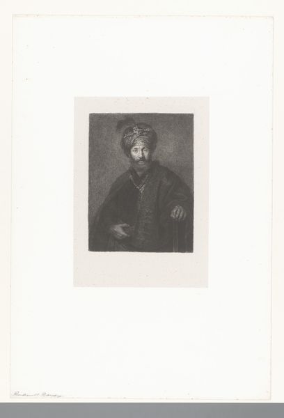 Editor: This is "Portret van ambassadeur Yussouf Aguiah Efendi," an engraving by Nicolo Schiavonetti from 1794. It’s currently held at the Rijksmuseum. The ambassador’s contemplative gaze and the letter he holds really give off a serious and diplomatic vibe. How do you interpret this work within its historical context? Curator: Well, seeing as this was made during a period when Europe was actively engaging with and often exoticizing the "Orient," we have to consider this portrait not just as a likeness, but as a representation of diplomatic power. It's intriguing to consider how Schiavonetti, a Venetian artist, positioned Aguiah Efendi, the Ottoman ambassador, for a European audience. Editor: So, it’s less about pure representation and more about crafting an image for political consumption? Curator: Precisely. Look at the classical architecture subtly placed in the background. It subtly connects the ambassador with a lineage of power and civility understood by Europeans. Do you think that impacts how viewers at the time saw the Ottoman Empire? Editor: Definitely! The neoclassical elements make the ambassador seem less “other” and more relatable to the European sensibilities of the time, a calculated move perhaps? It definitely frames the East/West relationship differently than some more purely orientalist artworks. Curator: Exactly. This isn't simply an ethnographic study. It reflects a conscious negotiation of cultural and political image, meant to influence perception and policy. It reminds us of the politics embedded within seemingly straightforward portraiture. Editor: It's fascinating how much history and power dynamics can be read into a single image. It really challenges my initial assumptions.
