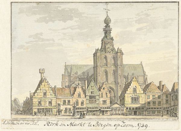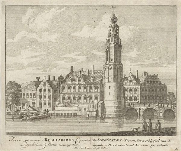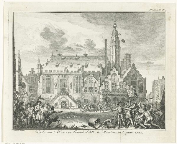Editor: This print from 1815 by Joseph Hunin, titled "Stadhuis te Brussel", showcases the Brussels Town Hall. It is a detailed engraving, a cityscape rendered in delicate lines. I’m immediately struck by the rigid symmetry. What can you tell me about the artist’s design choices? Curator: Note the meticulously balanced composition. The artist renders the facade and spire with remarkable accuracy, giving particular attention to linear perspective, drawing our eye towards a vanishing point high above the frame. This creates a pronounced vertical thrust, characteristic of neoclassical art. It exemplifies architectural rendering, in the print medium, intended for mass consumption. What do you notice about the relationships among form and the surface? Editor: I see how the details of the building are very precise, but the people and carriages seem less important, more like tiny, simple shapes used to give scale. Curator: Precisely. The emphasis remains on the architectural structure itself, presented objectively, devoid of emotional expression or social commentary, which could potentially be explored by some viewers.. This reflects the rational spirit of the Neoclassical period. What is communicated via this choice of form? Editor: I hadn’t thought about it that way before. So, the medium and the precise lines create a sense of order and present the building as something almost monumental and permanent. Thanks for clarifying. Curator: Indeed. We can deduce from the material presentation, form, line, and its visual language insights to the aesthetic values of the work itself, and Neoclassical aesthetics more broadly. Editor: Right, it’s the objective representation itself that communicates. Now I see.
