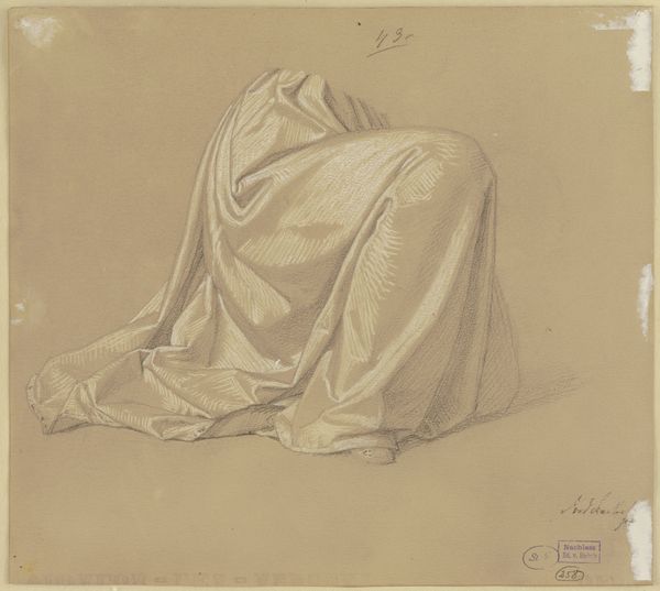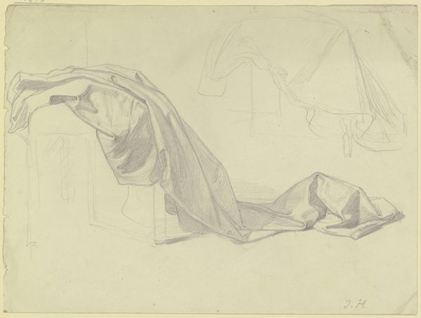 August Lucas created this drawing, "Study of Garments," with graphite on paper. The composition focuses on the draped fabric and the lower portion of a figure, immediately drawing your attention to the interplay of light and shadow defining the folds and contours. Lucas uses delicate, linear strokes to build volume and texture, capturing the way the fabric falls and gathers. The effect is a study in contrasts, where the softness of the garment meets the angular planes of the steps beneath. This contrast is not just visual; it suggests a deeper engagement with form. In focusing on the fabric, Lucas isolates and elevates the material itself, inviting us to consider the semiotic weight of clothing. The drawing prompts us to deconstruct the signs and codes embedded in sartorial representation. By focusing on this section, Lucas asks us to look beyond the figure and consider the abstract qualities of form and the cultural meanings we attach to them.