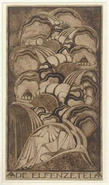 Curator: Donald Handel's print, "I shall pluck the sun and leave a gap for tears," presents a compelling visual puzzle. What's your initial impression? Editor: It feels like a lament, a ritualistic dance between light and shadow rendered in meticulous detail, that also feels very unsettling. Curator: I agree. The composition, almost symmetrical, relies on intricate linework. Note the balance between geometric and organic forms. The patterned textures create a vibrant surface. Editor: The central figure, seemingly skeletal, yet adorned, evokes a powerful, contradictory symbolism. The sun, and that cage, are strong images of both freedom and captivity. Curator: Indeed. The title suggests a disruption of natural order, a deliberate act of destruction perhaps echoed by the maze-like structure on the left. Editor: There's a primal quality to the imagery, as if Handel is tapping into some collective unconscious, some deeply rooted fear or longing. Curator: The artist's technical skill in etching allows for this range of textures, from the delicate lines to the denser, shadowed areas. It is quite effective. Editor: It's a powerful piece, demanding our attention, unsettling our assumptions. I see the artist using symbols to explore the dark side of human aspiration. Curator: A somber reflection, but one that reveals the artwork's complex artistry. Editor: Precisely.