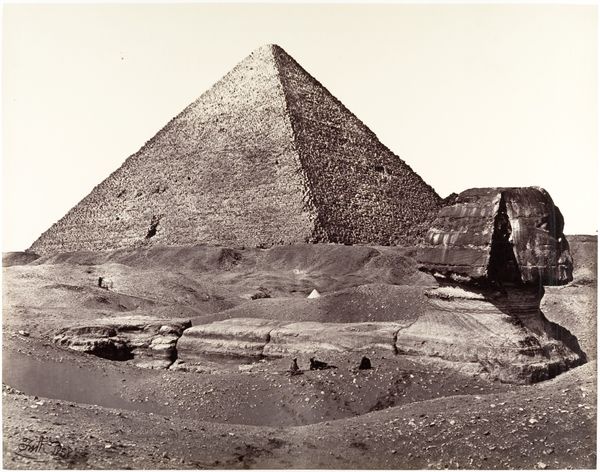 Félix Teynard created this photograph of the Pyramid of Cheops using a calotype process. Taken during an 1851-52 expedition, it reflects not only an interest in ancient monuments but also the burgeoning field of Egyptology and the colonial gaze of 19th-century Europe. Teynard’s photograph participates in a long history of Western fascination with Egypt, often overshadowing the lived experiences and perspectives of Egyptians themselves. The grandeur of the pyramid, rendered in sepia tones, evokes a sense of timelessness, yet it’s important to consider the complex social dynamics at play. The construction of the pyramids involved the labor of countless individuals, whose stories are often marginalized in favor of narratives of pharaohs and dynasties. Consider how the photograph frames our understanding of history. Does it invite curiosity about the people and cultures that created this monument, or does it perpetuate a sense of distance? Let's reflect on how we can approach historical sites and images with a more nuanced and respectful understanding.