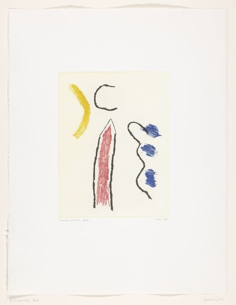 Editor: This is "Abstracte Compositie," created in 1994 by Harrie A. Gerritz. It's a mixed-media print on paper, currently housed in the Rijksmuseum. The colors, the way the shapes are balanced, give me a sense of serene contemplation, even… sadness, maybe? What catches your eye in this piece? Curator: Sadness, eh? That’s fascinating. For me, it's the tension, that lovely, quivering hum between the structured grid and the almost unruly bursts of color. It feels like a garden seen through a rain-streaked window, doesn't it? The geometric grid fighting against the organic nature of those floating, dappled forms. I wonder, what stories might these abstract shapes tell if we listen closely enough? Editor: A rain-streaked window… that’s beautifully put! I was so focused on the internal shapes; I missed the push-and-pull between order and chaos. The more I look at it, the more those blocks feel like they're straining against their boundaries. Do you think Gerritz intended to evoke that sense of struggle? Curator: Intention is a slippery thing, isn't it? But look at that red, perched so precariously above the green. There's a vulnerability there, wouldn't you say? A sense of reaching, perhaps even yearning. Or maybe, it’s just a splash of joyous rebellion against the grid! That's the wonderful thing about abstract art; it’s a mirror reflecting back our own emotional landscapes. Editor: I see what you mean. It's like the artwork allows us to find our own story within it, rather than telling us one directly. I initially read it as simply 'sad', but now it's much richer, a whole range of feelings are evoked. Curator: Exactly! And that's the beauty of it, isn't it? We've started with rain, journeyed through a bit of chaos and hope and rebellion, and ended up back at our own hearts.