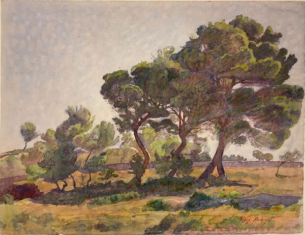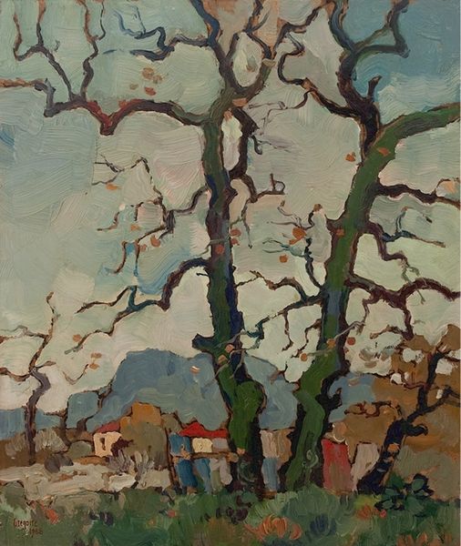 Curator: Gregoire Boonzaier's "Firs with Red Trunks, Kenilworth," created in 1969, presents us with a captivating post-impressionist landscape painted en plein air. Editor: My first impression? It feels like a memory. A very specific, sun-drenched afternoon kind of memory. The colours are so vivid, almost like he intensified them on purpose. Curator: Boonzaier's oeuvre, situated within the broader history of South African art, is quite interesting. His choice of painting outdoors allows us to think about this artwork in the context of accessibility, but more importantly the question of representing landscape and national identity. It pushes viewers to interrogate their relationship with the natural environment, especially regarding land ownership and racial segregation during apartheid. Editor: Absolutely. And those "red trunks," right? It’s not just about depicting a scene accurately. The red almost feels…symbolic? I'm seeing warmth, vibrancy… a kind of defiant energy rising from the earth. It's as though the painting asks "what does it mean to belong?" through colours rather than words. Curator: I think your reading on defiance is very acute. Boonzaier did paint and sketch scenes of District Six—the inner-city suburb forcibly cleared of its coloured residents under the Group Areas Act. And as he returned to landscape painting after that, he did so by insisting on using brighter colours that resisted any claim to that land by the ruling regime. Editor: Art’s subtle resistance! That explains it. Seeing it now, those feathery brushstrokes making up the leaves, and those resolute red trunks – they're less about being “pretty” and more about asserting the right to see beauty, to claim it. Curator: Exactly! Even his impressionistic style, evoking fleeting moments, might be seen as a rejection of rigid, enforced perspectives. This allows a contemporary viewer to meditate on issues like environmental justice, displacement, and resistance through art. Editor: Well, now that I know that it feels…more whole. Like understanding a private joke that makes the punchline even funnier! Thanks to his personal style and those red tree trunks! Curator: Indeed! Thank you for sharing such intuitive reactions. Boonzaier's painting definitely embodies layers of significance through form and style.