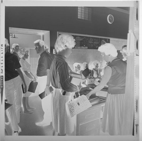 Editor: This is an Untitled photograph by Jack Gould, depicting a graduation scene. It’s interesting how the girls on stage are the focal point, but their backs are to us. What do you make of that? Curator: The averted gaze is powerful. It places the viewer in the position of the audience, those seated. This creates a sense of shared experience, almost voyeuristic. The clock on the wall, the formality of dress, these are visual cues that speak to ritual, societal expectation, and the passage of time. What do these symbols evoke for you? Editor: I guess a sense of anticipation, but also maybe a bit of melancholy? Curator: Precisely. The image becomes a mirror, reflecting our own memories and understanding of such events. It reminds us that these moments are both personal and universal. Editor: So, it’s more about what the image represents than what it literally shows. Curator: Exactly. The symbols elevate it beyond a simple snapshot, inviting us to contemplate larger themes.