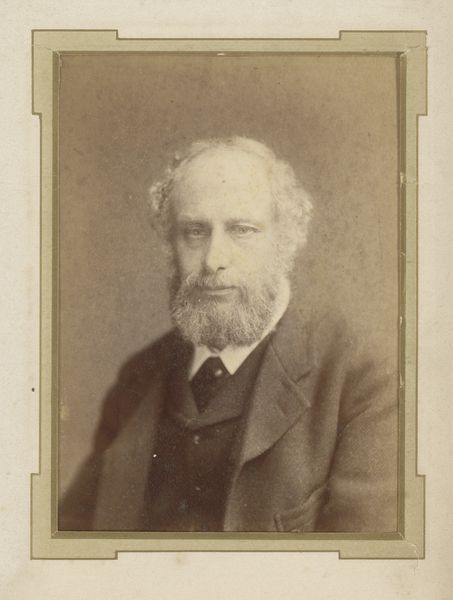 Editor: Here we have "Portret van een man uit de familie Marmelstein, vermoedelijk de vader van A. F. Marmelstein," dating from somewhere between 1850 and 1900, currently housed in the Rijksmuseum. It’s an albumen print. It has a formality to it. How would you interpret the composition of this work? Curator: The image commands attention through its stark composition and limited tonal range, resulting in what appears to be a deliberate exercise in simplicity. Observe the subject's centered placement and the almost symmetrical arrangement of his clothing. The textural contrast is most evident in the distinction between the soft focus of his hair and beard, versus the comparative sharpness of his facial features. Does the even lighting across the portrait strike you as contributing to a specific mood or effect? Editor: I hadn't really thought of it, but the lighting flattens the image and emphasizes the man’s expression, even his gaze. How does that direct our understanding? Curator: Precisely. Consider the meticulous arrangement of form and light; they prioritize the character of the subject, an unembellished rendering. The photograph, in its rigorous composition, seems to reflect the ethos of the era. Can we view it as more than just a historical artifact, and instead examine its own structured system? Editor: I suppose viewing it solely through a historical lens might limit our appreciation of the technical and artistic choices, but seeing the details you highlighted definitely opens up a fresh perspective. Curator: Indeed. The play of textures, the calibrated contrast, and overall composition offers a deeper understanding of this portrait's enduring appeal. Editor: Thank you! It has been insightful to appreciate these compositional techniques.