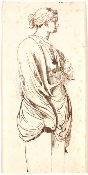 Editor: This ink drawing from 1900 by John Singer Sargent is a costume design titled "Design for Hawk Dress for Mrs. C.E. Hunter as Queen Phalema in 'The Seraph.'" I'm immediately struck by how much it resembles ancient Egyptian imagery but filtered through a turn-of-the-century lens. What do you see when you look at it? Curator: Well, immediately I’m drawn to the materiality of the piece. Look at the stark contrast of ink on paper. This is more than just a sketch; it’s a record of Sargent's process. The deliberate strokes, the varying pressure... it all points to a system of artistic production that’s rooted in both traditional methods and a burgeoning industrialization of art. Notice how this detailed, hand-drawn design was likely intended to be reproduced. What does this tell us about the commercial aspects of theatrical production at the time? Editor: That’s interesting. I was focused on the dress itself, but you’re making me think about the larger industry. So, the act of drawing, the very materials used, speak to that commercial reality? Curator: Precisely. The choice of ink and paper—relatively inexpensive and easily reproducible materials—indicates a functionality beyond mere artistic expression. This design served a purpose; it was a blueprint, intended to be translated into a tangible garment. Consider the labor involved in crafting that hawk dress from Sargent’s design – who were the workers involved? What kind of fabrics would they have used? The drawing is just the starting point of a whole system of making. How does it reflect class distinctions? Editor: I hadn't thought about it that way at all! It shifts the focus from just admiring the aesthetic to understanding the social dynamics involved. This drawing then becomes less about Sargent and more about the collaboration, even exploitation, within the Edwardian theater scene? Curator: Exactly! It is about interrogating those power dynamics and examining the very tangible realities of artistic creation in a specific historical moment. Editor: Thanks for pointing that out. Now I see that this drawing holds much more complexity than just a pretty design. It makes me want to research who was actually making the dresses back then! Curator: Absolutely! By tracing the object’s journey through various hands and workshops, you’ll gain a deeper appreciation for the hidden narratives embedded in art.