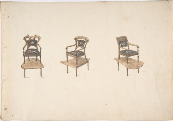 Curator: This intriguing engraving from between 1745 and 1775, housed here at the Rijksmuseum, presents three distinct chairs, each labeled in French. Editor: It strikes me as rather austere, despite its Rococo roots. The cool lines, precise details… it almost feels clinical in its presentation. Curator: Precisely. While employing Rococo style—see the ornamentation on the frames—its purpose leans towards documentation, a dissemination of design ideas. This print form allowed designs to reach a wider audience than unique, crafted examples ever could. Editor: The interplay of textures is fascinating though, the smooth curves of the wood offset by the canework of the chair backs and seats. The central chair, upholstered, presents another textural experience entirely. There’s a visual dialogue happening between these three pieces, right? Curator: Indeed. "Chaise de Canne", the two on the sides, cane chairs—relatively common—flanking the more luxurious "Fauteuil en Cabriolet". These prints reflect a burgeoning consumer culture. Furniture styles, once determined solely by the artisan or commissioner, now faced standardization through prints like these, disseminated throughout Europe. The market was demanding new styles, new forms. Editor: That's a potent thought. The print medium transforming design itself. It makes one think about the democratization of taste or perhaps even standardization? The fine hatching is noteworthy; see how they achieve depth with what must have been painstaking execution? Curator: Undoubtedly laborious! And the proliferation of such images definitely played a pivotal role in shaping taste, influencing not just the elite but also increasingly, the middle classes who aspired to these designs. These images democratize taste, which comes at the cost of individuality in favor of social mobility through owning desirable objects. Editor: Food for thought. So much precision goes into something depicting forms designed for comfort and leisure. Curator: Prints like "Drie Stoelen" grant us insight into a world transforming—consumption, access, design's diffusion—mirrored in these seemingly simple lines. Editor: Agreed. I see more than chairs now; I see social change etched onto paper.