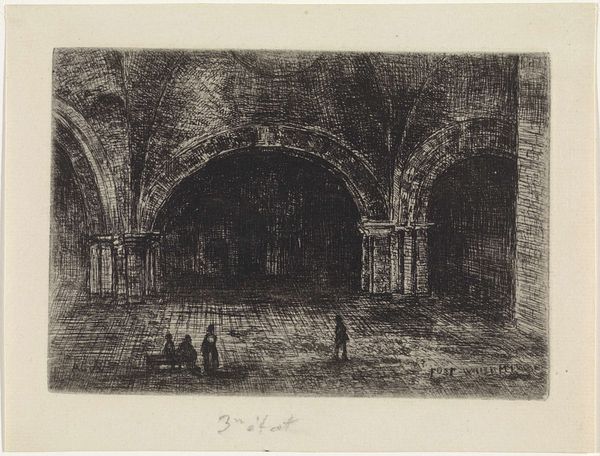 Alexander Schaepkens created this etching of Fort Koning Willem I in Maastricht sometime in the 19th century. Initially, the eye is drawn to the interior's imposing architectural structure. The use of hatching and cross-hatching creates a pervasive shadowy atmosphere, adding depth. Schaepkens employs the repetitive archways to explore themes of spatial confinement. The deliberate use of linear perspective draws our attention to the background, which is shrouded in darkness, suggesting something unseen, unknown, or even ominous. The figures, dwarfed by their surroundings, appear almost as afterthoughts. They accentuate the overwhelming scale of the fort. Consider how the sharp contrast between the detailed foreground and the obscure background affects our perception. Schaepkens seems to be questioning the nature of seeing and knowing, suggesting that what we perceive is always just a fraction of a larger, more complex reality. Each stroke is deliberately placed to build up layers of meaning beyond mere representation.