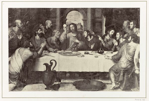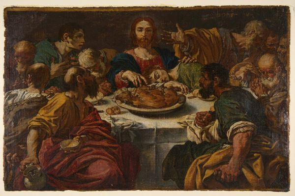 Editor: This is John Cranch’s "Monks Merrymaking." The figures are so expressive, and the oil paint has a real richness. What do you make of the scene here? Curator: Note how Cranch uses readily available materials to depict a scene of consumption and leisure. The roughly hewn table, the earthenware bowl, even the monks' robes, all speak to a specific economic reality and localized production. Editor: So, it's less about the narrative and more about...the stuff? Curator: Exactly! Consider the labor involved in producing the wine they’re drinking, the crafting of the glass. These are the material conditions that enable this "merrymaking." Editor: I hadn’t thought about it that way. It gives a totally different context to the image. Curator: Indeed, shifting focus to production and consumption reveals the socio-economic underpinnings. Editor: Fascinating. Thanks!