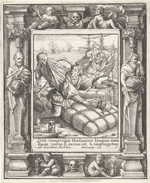 Curator: Here we have "The Abbot and Death," a remarkably detailed engraving created by Wenceslaus Hollar in 1651, currently held in the Rijksmuseum collection. Editor: It’s incredibly stark. The tight lines create a real sense of urgency, and a bit of dark humor, if I dare say. The contrast is compelling, a little heavy, don’t you think? Curator: I find the interplay fascinating, especially when we look at the visual rhetoric at play. Notice the abbot confronting Death— he raises a book as if warding off evil, while attempting to clothe Death in his vestments. Editor: The diagonal lines create a really powerful sense of motion, leading our eyes from the broken hourglass at the base, all the way up to the skull above, crowning the scene. It’s very cleverly structured to give a clear focal point despite the detail. Curator: Precisely. The hourglass symbolizes time running out, a common memento mori motif that acted as a reminder of mortality. Then we see the figures on either side of the frame – the armed warrior on the left representing physical power, and the draped figure on the right maybe as worldly knowledge or poverty -- are ultimately rendered powerless before death. Even the ornamental setting suggests a hierarchy of life, and all will come to the same end. Editor: It's skillfully arranged—balancing the literal narrative within the frame with these broader symbolic flourishes. Didactic, but definitely with artistry. The engraver really utilizes that tension. Curator: These reminders were a comfort to some – they served to give medieval societies assurance that a familiar cultural story would continue. Life, then death, then...something else. Editor: Seeing how the scene is carefully composed, I'm struck by the timelessness of the composition. Its themes clearly outlive any single moment. Curator: Ultimately, Hollar’s commentary becomes an invitation to confront our shared mortality, framed through both sacred and secular contexts, creating a rich tapestry of understanding that transcends the constraints of its time. Editor: Indeed. Beyond just a technical exercise, this feels very calculated in its formal effect, something carefully planned to last beyond Hollar's own lifetime.
