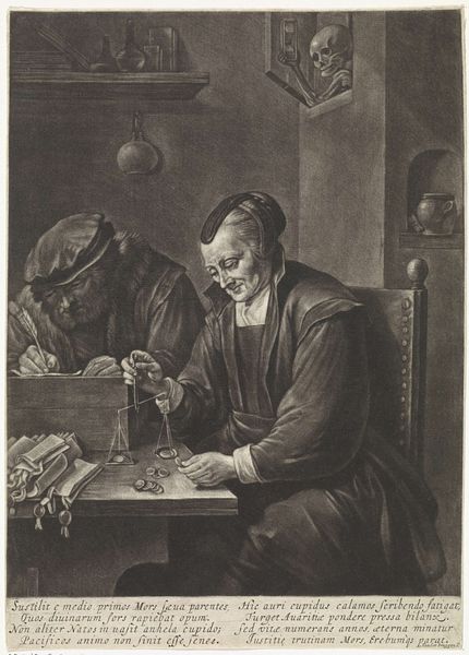 This is a monochromatic artwork by Thomas van der Wilt, titled 'Old Woman Examining Coins'. The visual field is immediately dominated by stark contrasts of light and shadow. We see a hunched figure illuminated by the glow of a lantern. The artist masterfully manipulates light to draw our eye to the old woman's face and the coins in her hand. This meticulous attention to detail and the use of light to create depth are reminiscent of the chiaroscuro technique, but here, it's applied not merely for aesthetic effect but to delve into themes of value and perception. The artwork invites us to reflect on the act of seeing and valuing. Is the lantern's light revealing true worth, or is it merely casting shadows of illusion? This ambiguity encourages us to question the established meanings of wealth and the subjective nature of perception.