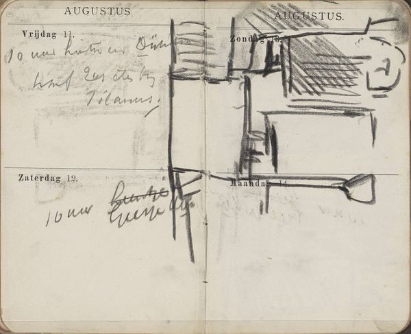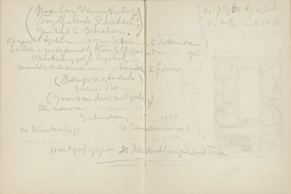 Editor: Here we have "Interieurontwerpen," a drawing from around 1928 by Carel Adolph Lion Cachet, currently held at the Rijksmuseum. It’s done in pencil on paper, and at first glance, it feels like peeking into an architect’s personal sketchbook. What do you see in this piece? Curator: Oh, it's a whisper from the past, isn’t it? A quiet, almost secretive glimpse into Cachet's mind. What I adore is the immediacy, the casual intimacy. It's not a grand statement but a collection of thoughts jotted down. Imagine him, perhaps on a train, his mind racing with ideas for interiors. It’s less about the precision of architectural drafting and more about the poetry of design. Do you notice the mix of geometric forms with the free-flowing handwriting? Editor: Yes, I hadn’t really thought of it as poetic, but I see that now, especially how the text and drawings almost blend into each other. What strikes me is how rough and raw it all is, even though he was clearly a skilled artist. Curator: Exactly! It's unfinished, open-ended, like a song without a final verse. It's a raw artifact of the creative process itself, not meant for public consumption. Consider the era, too. Modernism was blossoming, a break from ornamentation. This drawing mirrors that spirit of experimentation, don’t you think? It is like a Jazz improvisation— Cachet letting his pen roam freely over the page to catch an elusive and important theme. Editor: That's a fantastic way to put it! Seeing it as an improvisation helps me understand it differently. It’s less about the final product and more about the exploration. Thanks, that’s very insightful. Curator: And thank *you* for seeing it with fresh eyes. These sketches are small portals that lead to surprising discoveries.