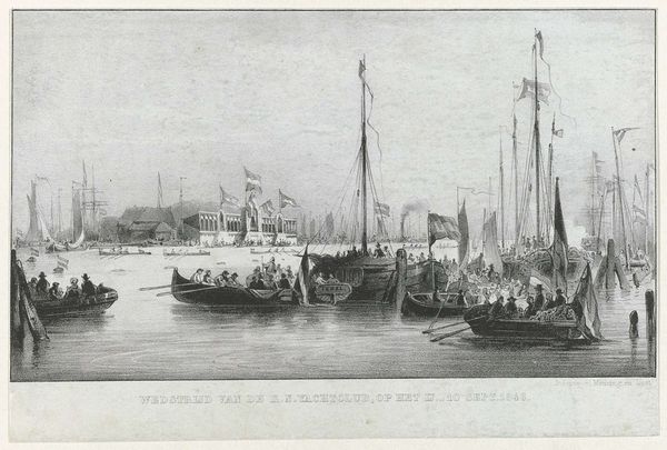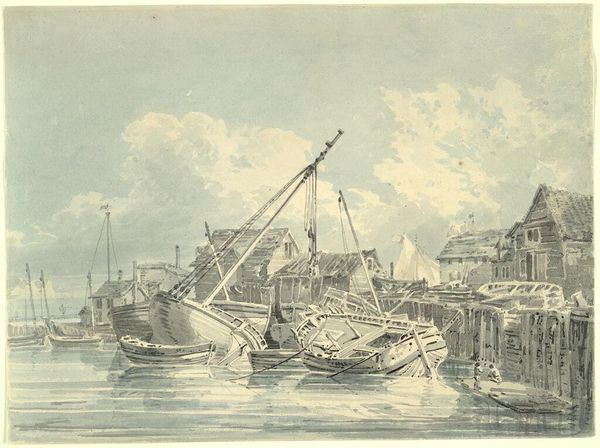 Curator: Here we have Alexandre Joseph Boens’ pencil drawing, "Arrival in Amsterdam of Refugees from the Flood, 1825," created between 1825 and 1826. Editor: Well, it certainly feels melancholy, doesn't it? All those soft grey tones lend it a kind of… distant sorrow. The light seems diffused, as if even the sun is weeping with these refugees. Curator: It captures a very specific moment in time and the symbolic importance of Amsterdam as a place of refuge. Boens’ choice of pencil evokes both fragility and the documentary impulse of Realism, giving immediacy to the narrative art on display. Note, for instance, the expressions on the faces. Editor: Yes, there is an element of almost journalistic record-keeping to it. And those stark sailing vessels...they practically scream “hope” against a backdrop of watery chaos, right? It's fascinating how such a muted palette can speak so loudly. The figures are small, but expressive – like tiny inkblots revealing stories of survival and displacement. Curator: Precisely. The ships themselves become symbols of resilience and continuity, and the artist gives this tragic historical moment visual permanence, connecting with collective memory. You see a continuity of narrative themes in times of disaster and crisis represented throughout art history. Editor: I'm particularly drawn to the perspective – or rather, how it feels almost cinematic. Like a freeze-frame from a grand, tragic opera unfolding on the waterways. I suppose that’s the Romantic sensibility at work, finding the sublime even in suffering. Makes you wonder about the individual stories behind those faces, doesn’t it? Curator: It does. The drawing encourages empathy. We look upon this moment and see the recurring patterns of human migration, and resilience, written through symbol, landscape and social themes. Editor: It's funny how a simple pencil sketch can unpack such complex human narratives, really! Curator: Indeed. A poignant rendering that bridges a specific historical tragedy with broader understanding.