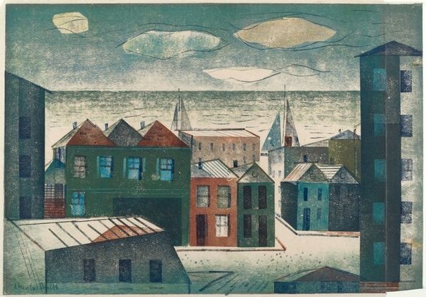 Editor: Here we have John Marin’s watercolor from 1922, "Three Houses, Barn and Chicken Coop, Stonington, Deer Isle, Maine". I am struck by how dreamlike it feels. It's almost as if he distilled a memory of this place. What kind of emotional and symbolic meanings do you see conveyed? Curator: It is interesting how you mention the dreamlike quality. For me, Marin has captured not just a physical location, but a feeling – a sense of place imbued with the past. Notice the abstracted forms of the houses. Do they evoke a sense of permanence, perhaps of New England resilience, despite their slightly unsteady appearance? Editor: I do see the sense of history you’re describing. It's subtle but definitely there. I can't help but notice how much white space there is. Curator: Indeed, Marin doesn't fill the canvas with detail. This deliberate use of emptiness contributes to the overall feeling. Consider how white can act as a powerful symbol: space for contemplation, or even the starkness of winter. Do you feel this negative space adds to the painting’s emotional weight? Editor: Yes, now that you point it out, I see how the openness invites a certain quietude, like the town is holding its breath. I hadn’t considered how strongly color can impact an emotion. Curator: Marin understood the power of suggestion. He uses color to convey mood and history, not simply to replicate what he saw. By inviting us into that open space, Marin lets us imprint ourselves on this setting and lets our memories and experiences do some of the work, making this town and its history ours. Editor: So, it is not just a painting of a landscape, but it's almost a painting of our shared memories of landscapes! Curator: Exactly! And a suggestion of what the future might hold for them, and us.