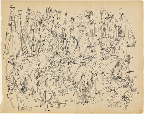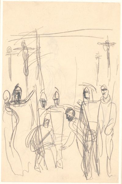 Editor: Here we have Ernst Ludwig Kirchner's "Drei Figurenkompositionen" from around 1920, rendered in ink on paper. It feels incredibly frenetic to me, like a fleeting glimpse of a crowd caught in motion. What do you see in this piece from a structural point of view? Curator: Observe how the artist employs rapid, angular linework, devoid of any attempt at naturalistic representation. The composition is segmented into three distinct zones, yet interconnected by the consistency of line and the recurrence of the human figure. This division could be seen as a visual exploration of simultaneity, presenting multiple viewpoints within a unified field. How does this fracturing of form impact your perception of the depicted figures? Editor: I think it makes them feel very fragmented, almost dehumanized. It's hard to connect with any one figure when they are presented like that. Does this connect to his Expressionist style? Curator: Precisely. The expressionistic impulse hinges upon the distortion of form to convey heightened emotionality. The rapid, jagged lines don't merely depict figures, but transmit a sense of unease, instability, even anxiety. The monochrome palette further accentuates this emotional rawness, directing our attention to the dynamic interplay of line and form, freed from the distractions of color. Note the relative lack of interior detail, the skeletal nature of the forms. What does this suggest? Editor: Maybe that the inner emotional state of the figures is exposed through these marks. It does make me wonder about Kirchner's own state of mind when creating this. I guess I was too focused on trying to recognize a realistic depiction. Curator: It's through those very deviations from mimetic representation that the artwork attains its expressive power. Through this controlled chaos, Kirchner creates a striking statement about the human condition. Editor: Thank you, that was very helpful. Now I see the drawing less as a failed attempt to capture reality, and more as a window into raw emotion through the power of abstract form.