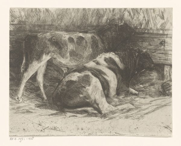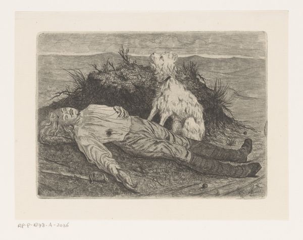 Curator: Eugène Van Hove's etching, "Two Lions Fighting Over an Antelope," likely completed between 1879 and 1910, presents a rather striking image of primal conflict. Editor: It's immediately brutal, isn't it? The raw tension conveyed through the dynamic composition of the lions and the limp form of the antelope creates an unsettling tableau. The stark contrast in light emphasizes the violence of the scene. Curator: The landscape surrounding the lions serves as a crucial structural element. The texture created by short, repetitive strokes builds into foreground and background planes of contrasting value which intensify the fight. See how the density of etching in the animals creates a focal point amidst the flat plain of the ground and sky? Editor: Lions fighting each other around an antelope carcass isn't novel. It signifies the conflict for resources, the natural selection processes, which are deeply rooted in symbolic systems. We instinctively associate these symbols of death and destruction with an almost Darwinian outlook on natural order. Curator: But, while the subject itself is conventional, consider Van Hove’s execution. The intricate network of lines – particularly within the manes of the lions and along the body of the antelope – imbues the image with an intense textural presence. They build formal volume through a subtle layering of tone. Editor: Yes, and the image also captures an interesting blend of raw animality and...something almost aristocratic in the stance of the lion atop the prey. It's as though a lord has bested an enemy for spoils. Curator: Ultimately, Van Hove’s attention to the pure rendering of forms and the formal composition of the animals elevates this simple etching beyond a basic genre painting. It becomes a very compelling meditation on texture, balance, and tension. Editor: It speaks to enduring concepts of competition and mortality, reflecting the perennial dance of survival, doesn't it? Even now, these same archetypes repeat around us, reminding us of this primal narrative in unexpected places.