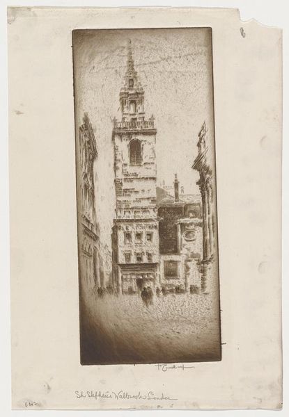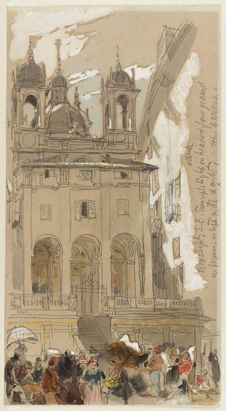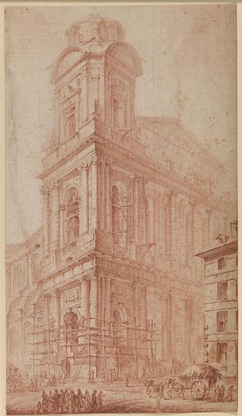 Curator: Kenneth John Conant's sketch, "S. Pietro from the Borgo Vecchio, Rome, Italy," presents a view of St. Peter's Basilica framed by the narrow Roman street. Editor: It feels almost claustrophobic, doesn't it? The basilica, a symbol of immense power, is reduced, squeezed, by the mundane reality of the city. Curator: The linear perspective is quite striking. Conant uses the buildings on either side to create strong converging lines, drawing the eye inexorably towards the dome. Editor: Yes, but that also emphasizes the power dynamic. The street, the people within it, are all subjected to the architectural dominance of the Church. Consider the history of the Borgo Vecchio. Curator: Structurally, the dome's curves contrast beautifully with the sharp angles of the buildings. It’s a compelling play of geometric forms. Editor: And what about the figures at the base of the basilica? They are small, almost insignificant, compared to the structure looming above. Who gets to experience the wonder? Curator: A wonderful point to consider. Conant gives us not just a building but a social statement. Editor: It's a reminder that even the most magnificent structures are embedded in everyday life.