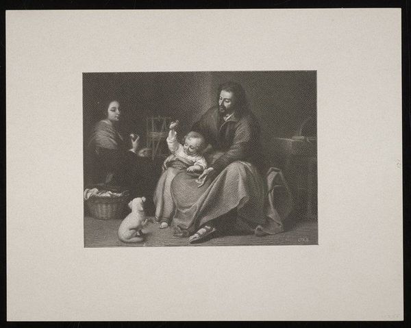 Curator: Let's examine "The Holy Family of the Little Bird," a wood engraving created in 1905 by Timothy Cole, now held at the Minneapolis Institute of Art. Editor: My first impression is the sheer labor evident in the marks themselves. The cross-hatching creates a somber, almost humble mood, appropriate given the theme, of course. Curator: Indeed. This piece asks us to consider how traditional iconography interacts with emerging industrial methods of reproduction. Look at the portrayal of domesticity, almost sentimental. But then reflect on the socio-economic forces enabling Cole to disseminate such a familial ideal to a wider audience. Editor: Right, because the very act of making these wood engravings requires an artisanal skill becoming quickly displaced by machine reproduction at the time. You’ve got hand work depicting humble work! What materials did Cole employ and where did they come from? And, of course, we must acknowledge the labor involved. Curator: It forces us to question whose realities are valued and represented and which remain in the shadows. The gaze of the Virgin seems resigned, distant. I wonder, what constraints was Cole operating under, recreating and also perhaps critiquing this representation of domesticity and spirituality? How were images like these deployed ideologically? Editor: The composition strikes me. The darkness in the background, emphasizing their physical closeness, almost cloistered as it seems separated from outside life. And even this little bird that grabs baby Jesus’ attention could have ties with their relationship with nature: Is it a representation of their environment and even of the family's dependence on this nature? Curator: It also reminds us that religious narratives often reinforce the patriarchal structures, portraying women primarily in their roles as mothers and wives. Is there something revolutionary even for those figures that is presented by this scene of domestic harmony, or is it merely a replication? Editor: We can appreciate the family moment, and appreciate also the sheer materiality: the labor involved to make an income by providing wood engraved images in a machine-produced economy. These layered paradoxes are just… palpable. Curator: Absolutely, these dialogues highlight art’s complexities: the individual and cultural forces woven together in its creation and reception, opening spaces for meaningful, critical reflection. Editor: A dense nexus, for sure! I think exploring its tangible and historical properties reveals stories beyond what it depicts to what the artist makes it and it provides to us to contemplate today.