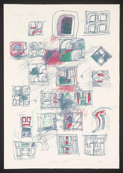 Curator: This intriguing study in ink on paper comes to us from Gordon House. House, born in 1932, was a British artist and designer known for his abstract works that often blurred the lines between fine art and graphic design. Editor: Oh, this feels like peering into an architect's sketchbook, all these little worlds contained in squares. It's so playful, like a visual puzzle. Curator: Indeed. It's evocative of the minimalist and constructivist movements, mirroring a post-war sensibility that sought to redefine societal norms through abstraction. The grid format itself is highly political. Editor: I see that. It’s like each square is a little rebellion, a tiny world resisting the big picture. It’s the little things. Curator: Precisely. They reflect a broader negotiation with power structures. Editor: Well, I feel inspired to grab my own pen and get to work, who knows what tiny rebellions I can create? Curator: A sentiment I wholeheartedly share; House's work encourages us to question, design, and ultimately, reimagine the systems we inhabit.