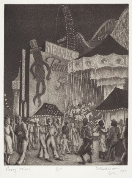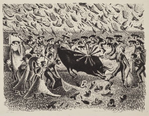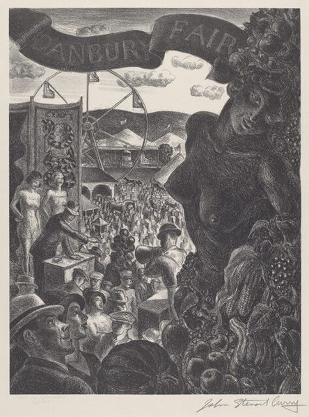 Benton Spruance created this lithograph, ‘The People Play – Spring,’ presenting a complex allegory of life and death. Note the bi-plane bearing the name ‘Venus,’ juxtaposed with the skeletal figures in the lower right corner. This contrast recalls the vanitas tradition, where symbols of earthly pleasures are paired with reminders of mortality. Consider the image of Venus, who has been worshipped since ancient times and represents love and beauty, but whose name is inscribed on a machine that is likely to bring death. In a different context, her symbolism of love and beauty is celebrated by Botticelli, who painted ‘The Birth of Venus.’ In that painting, she appears ethereal and divine, while in ‘The People Play – Spring,’ the presence of Venus above the fairground injects a sense of disquiet. This dichotomy speaks to the recurring motifs of life and death, hope and despair, that are etched into our collective consciousness, resurfacing across eras, reminding us of the cyclical nature of human existence and the eternal dance between Eros and Thanatos.
