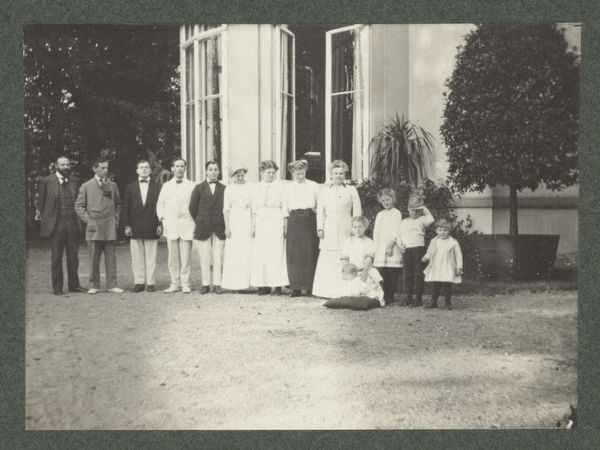 Curator: This photograph, titled "Genodigden luisteren naar toespraken tijdens de onthulling van de 'Junius-bank' in Tandjongkarang", captures a moment from sometime between 1933 and 1935. It resides here with us at the Rijksmuseum. Editor: My initial feeling is one of muted anticipation. A gathering, everyone clad in white… the air feels thick with expectation despite the rather humble, almost commonplace setting. Curator: Look at how the uniformity of dress and the act of listening centralizes the community here. White, of course, can symbolize purity, new beginnings, perhaps marking an official occasion, one filled with ritualistic intent. Editor: But who were these invitees, and what's the social makeup of this crowd? Their matching outfits hint at labor, or public sector jobs. A uniform speaks volumes about hierarchy and perhaps enforced compliance with dress code that reflect a deeper control, wouldn't you agree? Curator: Undoubtedly. Notice the placement of the trees framing the scene? Natural elements juxtapose with rigid formation to draw attention to shared communal space. Even the shadows falling seem to amplify stillness of listening. Editor: I'm more drawn to the solitary figure standing apart from the assembly. Look at their khaki clothing – suggesting either military presence, the state – even authority over the gathering. One cannot simply dismiss the material disparity displayed so starkly. Curator: Precisely, and the bicycle suggests transport and connections, possibly access others might lack, adding dimension with mobility and function against that singular figure’s power positionality, you notice there is no hierarchy here with those assembled, creating harmony amongst its invitees. Editor: And this "Junius-bank"? The labor to make these public structures has significant social, financial cost. Where the material obtained from and who profited in such endeavour that required so much group conformity. I suspect a tale woven of community endeavor, colonial structure and silent obedience that speaks volume today in ways. Curator: Absolutely; considering that the work lives at the Rijksmuseum, you can consider the way colonial heritage is revealed here! Editor: Indeed. Understanding not just the symbolic gestures but the lived materialities shaping even these paused instances within photography provides deeper insight.