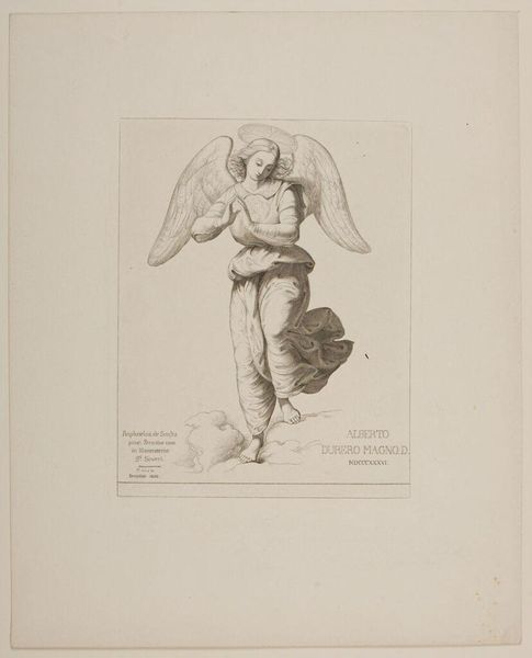 Editor: This is Giovanni Paolo Lasinio's "Angel Playing Lyre." It's an engraving, and the angel seems to be floating serenely. What do you see in this piece in terms of its social implications? Curator: Look closely. How does the angel's idealized form reinforce or challenge societal expectations of beauty and femininity at the time? Consider, too, the role of religious art in perpetuating power structures. Does this angel serve those structures, or offer some form of resistance? Editor: I hadn't thought about it in terms of power. It’s more than just a pretty picture. Curator: Exactly! Art always exists within a complex web of social and historical forces. Hopefully, that awareness will inform your future viewing.
