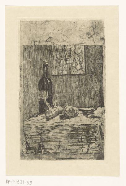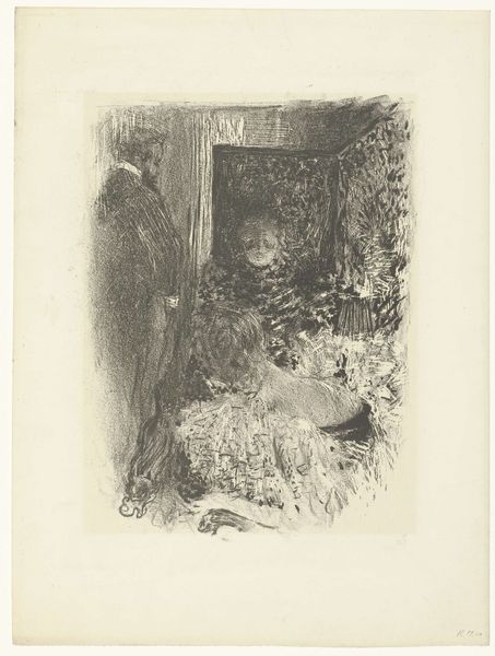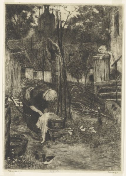 Felicien Rops made this etching, titled "Hangend in een klokkentoren", at an unknown date. Here, we see a body suspended within a bell tower. Rops was Belgian and active in the late nineteenth century, a period of rapid social and political change. His work often grapples with themes of social decay and the darker aspects of human nature, frequently critiquing the institutions of his time. The setting – a bell tower, traditionally a place of solemnity and community gathering – is defiled by the presence of death. The birds of prey circling the body suggest a world out of balance, a society feeding on its own. Rops's mastery of the etching technique adds to the grim atmosphere, with stark contrasts and fine lines capturing the macabre details. To fully appreciate Rops, one should look at his images in the context of Belgian social and cultural history. Newspapers and criminal archives can offer a glimpse into the social issues that fueled his artistic vision. By understanding these contexts, we can better understand art's power to reflect and challenge social norms.