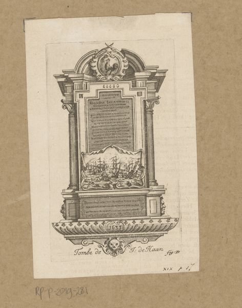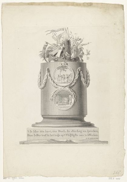 Curator: This engraving from 1774 is entitled "Titelprent voor de prentreeks: Afbeeldingen van den Schouwburg te Amsterdam" and it comes to us from Reinier Vinkeles. It's part of the Rijksmuseum's collection. It shows a detailed architectural structure, seemingly a monument or pedestal. What strikes you first about this work? Editor: Its monumental severity. The linear precision in the rendering, especially with that faux woodgrain background, creates a somber tone. It’s more architectural plan than celebratory image, wouldn’t you say? Curator: I can see that. For me, I think about how such images were disseminated. This was intended as the title page for a series of prints about the Amsterdam theater, placing this institution in a longer, grander tradition, evoking the theaters of antiquity with its neo-classical design. Editor: Yes, but there's also a flattening effect, isn't there? It adopts Neoclassicism – referencing the antique to give authority, but the effect is stilted. The symbolism, the cherubs and draped fabric… they lack the dynamism you might expect. Is it about glorifying the *idea* of theater rather than its reality? Curator: Perhaps. Look at how text is centralized in the composition. The words describing the theater’s architects are framed within that structure. I think it says that theatre's value lies not just in entertainment but in the civic structures it reflects and upholds. Theatre as a foundation for social order. Editor: And yet… the monument feels rather… empty, doesn’t it? Those architectural follies, with nothing actually happening around or in them, tend to signal impending obsolescence to me. What good is tradition if no one's breathing life into it? Curator: That's a compelling thought. The rigidity could reflect anxieties about cultural relevance even at that time. Maybe that embrace of Neoclassicism wasn't just an homage, but a desperate attempt to legitimize the theater's role. Editor: Or perhaps it highlights how institutions constantly perform for authority, displaying rather than truly embodying ideals. This title page serves as a testament to the cultural pressures imposed onto theatre, then and now. Curator: Indeed, Reinier Vinkeles' image isn't merely a depiction; it's a carefully constructed statement about theater's place in Amsterdam's cultural landscape. A fitting point to reflect on, wouldn’t you agree?