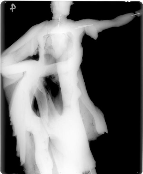 Editor: Here we have an X-radiograph of Gaston Lachaise’s "Woman Figure." Seeing it like this, almost skeletal, makes me think about how we preserve art and the layers of meaning beneath the surface. What's your take on seeing a sculpture presented in this way? Curator: It's fascinating. Radiography reveals the unseen, making the art object a subject of scientific inquiry. The museum becomes a lab, and the sculpture transforms from aesthetic object to a specimen, raising questions about institutional control and the politics of display. Editor: So, it's not just about seeing the structure, but questioning how we value and examine art? Curator: Precisely. It challenges traditional art historical views, prompting us to consider the museum's role in shaping perception. Editor: That's given me a lot to think about, especially regarding how museums frame our understanding.