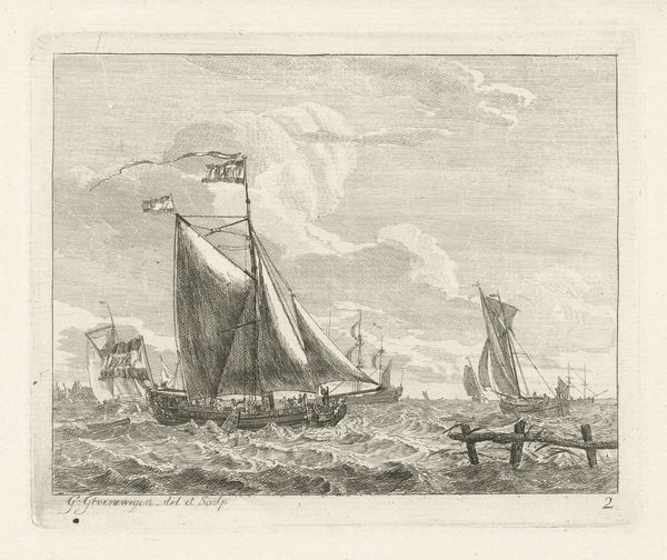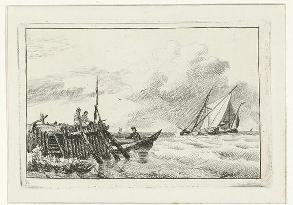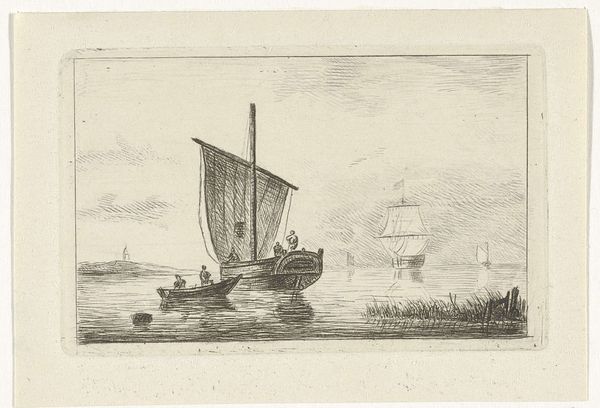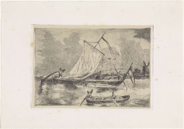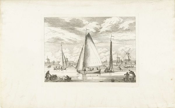 This etching of a sailboat, titled "Zeilschip met vier mannen," was made by Willem Gruyter jr. The etching process begins with a metal plate, likely copper or zinc, covered with a waxy, acid-resistant ground. The artist then scratches an image into the ground with a needle, exposing the metal beneath. When the plate is submerged in acid, the exposed lines are bitten, creating grooves. Ink is then applied to the plate, filling these grooves, and the surface is wiped clean. Finally, paper is pressed against the plate, transferring the ink to create the print. The image's stark black lines and textural variety depend upon the etching process. Varying depths of the groves translate to varying tones of blackness on the page. This printmaking technique allowed for the relatively quick production of multiple images, expanding access to art beyond unique paintings or drawings. It democratized image making and consumption in a way that mirrors the burgeoning industrial revolution. The emphasis on process in printmaking reminds us that art is not just about the final image, but the labor and techniques embedded within it.