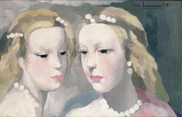 Marie Laurencin's painting presents us with two women adorned in stylized headwear, evocative of the Commedia dell'Arte. These figures, draped in what appears to be jester-like hats trimmed with baubles, recall the archetypes of Harlequin and Columbine—characters whose roots stretch back to ancient theatrical traditions. Their costumes speak to the idea of disguise, role-playing, and the fluidity of identity. The harlequin figure has origins that delve deeper than theatrical entertainment, reaching into ritualistic realms with pagan roots associated with spirits. The mask, the motley garb, they signify not just revelry but also a connection to forces beyond the tangible world. Like Dionysian figures of antiquity, it resurfaces continually across centuries, adopting new forms to convey similar subconscious desires for liberation from social restraint. Laurencin evokes a complex interplay between appearance and reality, echoing how symbols evolve through time, carrying emotional weight, and reflecting our deepest human longings.