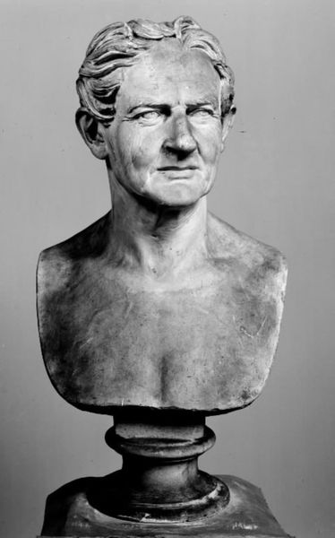 Curator: Hello and welcome. We are standing before H.W. Bissen's marble sculpture "Badelæge Vincenz Priessnitz", created in 1844. It resides here at the SMK, Statens Museum for Kunst. Editor: What strikes me is how… reserved this sculpture feels. It's solid, cold. The way the light plays on the marble, it almost makes him seem translucent, yet utterly impenetrable. Curator: Indeed. Bissen was a master of neoclassical ideals, focusing on clean lines and idealized forms. Observe how he captures the subject, Vincenz Priessnitz, with an emphasis on rational order and calm authority. Note the precise anatomical rendering, the carefully sculpted hair, and the even, almost emotionless gaze. Editor: He does look terribly serious, doesn't he? You'd think the father of hydrotherapy would have a twinkle in his eye, maybe a splash of water somewhere! It is very crisp though, if austere. But maybe that says something about the medical field at the time? Curator: Precisely. The work exemplifies the period’s belief in science and reason. It strives to capture Priessnitz's essence not as a man of exuberant energy, but as an emblem of controlled knowledge and mastery. It's not simply about likeness but about presenting a particular persona aligned with prevailing social values. Semiotically, his smooth skin denotes good health and wisdom; the toga suggests education. Editor: So, less about a jolly water doctor, and more about… the ideal of medical stoicism? Still, that cool, unreadable expression does invite a question: what thoughts, what hopes, are buried beneath all that exquisitely carved stone? Or perhaps it is commentary itself? A cool unemotional visage representative of that branch of scientific study? It’s like the sculpture itself has become a sort of beautiful, stone mask. Curator: Yes. It leaves the interpretation open-ended while imposing that air of objective truth that the Neoclassical period admired so greatly. Editor: It makes one ponder on the changing notions of 'ideal' within a culture. I like it, this marble man of mystery. A serious image of someone known for a less-than serious career. Curator: A fascinating testament to its time. Thank you for your insightful observations. Editor: And thank you for the art history lesson! I appreciate the chance to mull over this stoic fellow.