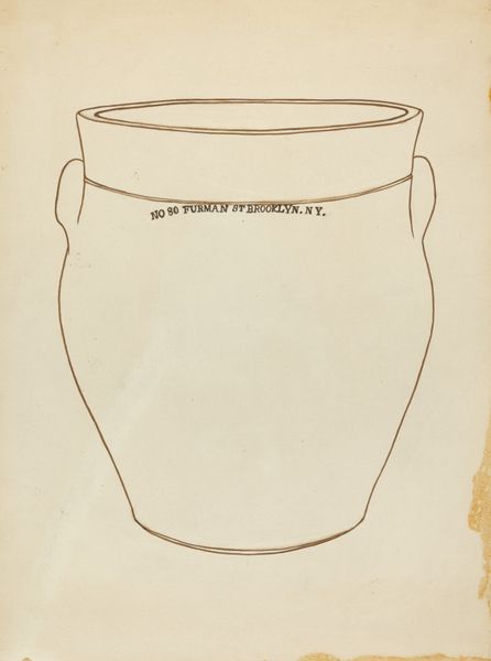 Curator: Here we have Yolande Delasser's "Crock," a blue ink drawing created around 1938. My first impression is the quiet austerity of it. The blue ink on the aged paper evokes a feeling of looking back in time, to simpler domestic life. Editor: That's interesting. I'm drawn to its classical allusions. The Crock references utilitarian objects while also echoing ancient amphorae. Its functionality transcends the immediate domestic space. What can we unpack there? Curator: Perhaps Delasser is suggesting a tension between the functional role of women in the household during that era, versus the timeless, enduring artistic expression found in these classical forms. The “Crock” becomes more than just a vessel; it's a commentary on containment itself. Editor: And think about the symbolism of vessels: repositories of memory, containers of sustenance, protectors of secrets. The Crock as archetype speaks to deeply held beliefs about home and heritage during the pre-war years in New York, don't you think? Curator: Absolutely. The blue ink drawing gives it a blueprint-like quality too. Are these the building blocks of something? How might this drawing be a part of imagining something, the possibilities contained and awaiting expression? Editor: That opens exciting avenues. What are your thoughts on the stylized, almost floral motif around the brand name "Corolius" on the pot’s side? What kind of branding of the pot did they imagine to attract potential customers, in that economic moment? Curator: I find this stylized motif strangely out of sync. While the body and form look strong, it introduces a touch of fragile beauty which may serve to undermine that austerity we discussed. Did Delasser feel conflicted here? Was she commenting on consumerism of domestic objects for the household? Editor: I think she presents a space to observe a range of tensions related to beauty, utility, classical references, and cultural values during a transitional period. Curator: It’s precisely this interplay of function and form that gives "Crock" such resonance. It speaks to us across time, asking questions about our values, desires, and the objects we surround ourselves with. Editor: A potent object, full of latent messages, from daily life that invite the viewer to delve below the surface of the drawing itself.