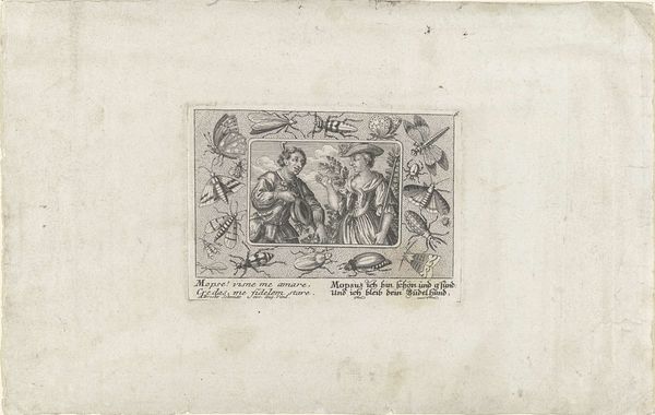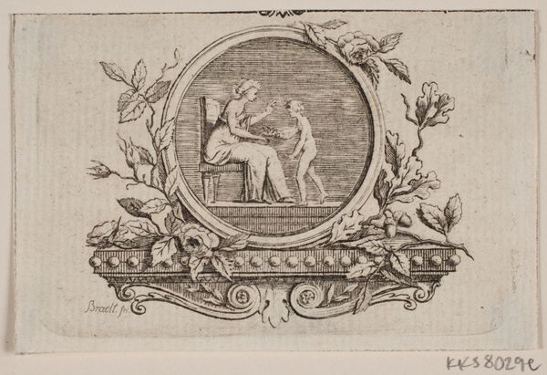 This is "Ovaal met parende herten," or "Oval with mating deer," an engraving by Paul (de Jonge) Flindt, created around the turn of the 17th century. Flindt was working during a time of great cultural and social change in the Netherlands, as the Dutch Republic was emerging as a major power. The overt sexuality of the deer set against the ruinous backdrop of the landscape may symbolize the complex relationship between desire, decay, and renewal. The deer, often seen as symbols of nature and instinct, are here depicted in an act of raw physicality. This contrasts with the crumbling architecture that speaks to the transience of human endeavor. One could see these ruins as an allegory for the body. The work asks us to consider the ways in which human and animal desires shape the world. The ornamental frame that surrounds the image serves to emphasize the tension between nature and artifice. Ultimately, the print invites us to reflect on the fleeting nature of life, and to contemplate the enduring power of desire.