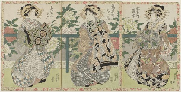 This triptych by Yōshū Chikanobu, titled "Excited Dogs," was likely made in the late 19th century using woodblock printing. The process begins with a drawing, which is then carefully transferred to a wooden block, often cherry. The artist then carves away the areas that will not be printed, leaving a raised surface. Each color requires a separate block, adding complexity to the process. Ink is applied, and paper is laid on the block, then rubbed to transfer the image. As you can see here, these colors range from vibrant reds and greens to pastels, all achieved through the painstaking layering of pigment. The crisp lines and flat planes of color are a hallmark of the technique, which demands precision and control. The artist’s labor is evident in the detailed rendering of textiles, the delicate features of the women, and the dynamic energy of the dogs. Paying close attention to these materials and processes, we gain insight into the aesthetic values and cultural context of the artwork, moving beyond a simple appreciation of its visual appeal.