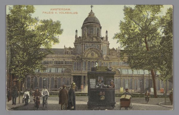 Curator: Oh, what a curious slice of seaside life. My first thought is how much everyone is dressed to the nines to simply be at the shore. Editor: Absolutely. Schaefers Kunst-Chromo offers us, in their artwork titled "Scheveningen, Rotonde Wandelhoofd," a glimpse into a past pleasure: promenading. This piece, estimated to be from between 1890 and 1920, really captures that epoch. It is an edition after a photographic representation from an earlier time. Curator: You can feel the photographic source under the printwork. The pale, cool hues, and the very stiff posture of these folks. They could almost be paper dolls pasted on that little pier. Editor: Precisely. We’re seeing here a society carefully curating its image of leisure and respectability. Scheveningen, already in this moment, had become a sought-after resort destination in the Netherlands for Europe’s elite. These architectural constructions, that rotunda, became powerful symbols of this modern seaside resort identity. Curator: That's some kind of structure. An elaborate gazebo or pier building? I can't quite place it. All those poles holding flags; is this a celebration? And all those well dressed members of society... the dresses, top hats. One can see the cultural emphasis on public presentation. Editor: Yes! This pier or promenade served not just as a physical structure but as a stage for social performances. These locations become focal points where the aspirations and anxieties of a society are subtly displayed and experienced. Curator: The architecture as a sort of... societal backdrop? It is not a stage, though, it is an event! Each person adding their expression to an almost carnivalesque scene... but a calm one! All very measured. There are not many faces showing elation. But everyone shows they belong, by their sartorial efforts. It really begs the question; what are we displaying today? Editor: An incisive question! Well, thinking about that, and in light of how seaside destinations transformed in popular European memory and leisure... it brings me pause to remember the impermanence of these grand scenes. Curator: It does, yes. I was thinking that myself. The Rotonde probably went away or lost a level of popularity and these lives we looked at through an old edition also went their way, after displaying on their epoch "the high style" of their ways and means. Fascinating glimpse.
