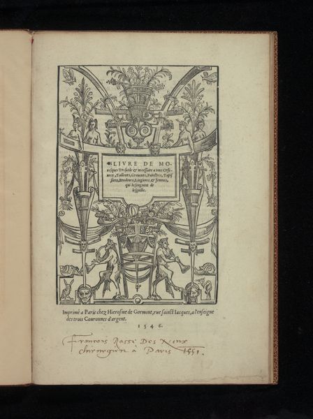 Curator: Looking at this print, “Elements d’Orfevrerie Divisés en deux Parties de Cinquante Feuilles,” dating to 1748, I see not just a historical object but a key to understanding the visual language of its time. The lettering, the ornaments… it speaks volumes. Editor: My first thought goes to the practical aspects—it’s a design catalogue, really, something very functional. There is some aging, a warm cream to the paper. Was it commonly bound in this green paper? And at 12 livres the price, was this meant for every jeweler's workshop or aimed at the higher-end workshops? Curator: I agree with you, but also see it as an insight to the era's values. Pierre Germain was very deliberate, I am certain of it. This is the book's front page! The typographical choices, the flourishes, these weren't accidental. Consider the garland. In heraldry, leaves represent growth and renewal. This image signals that the artisan embraces progress and that is appealing in every era. Editor: Exactly! Artisans were increasingly concerned with expanding their markets, not just tradition, as techniques shifted due to mechanization. These manuals aided distribution of knowledge! The design, meant for dissemination, is about practicality first, maybe with a veneer of cultural importance overlaid later, since its purpose is a commercial one. The inclusion of "avec privilège du Roy" speaks to its target consumer too! Curator: It’s interesting you say veneer. Privilege, though it represents something material, always serves as an indicator of prestige. These artisans saw themselves as guardians of quality in luxury. That’s very important to consider if you were an apprentice jeweler, trying to ascend in that guild hierarchy! Editor: But the image, while full of flourishes, exists in service of promoting the designs of silverware and jewelry. The 'elements' of metalwork, how to form them and build objects. It reduces a grand thing into steps. This hints that, from the outset, its about democratization in skills through accessible visual techniques and written language, so that more could participate in craft. It makes the skills involved easily accessible. Curator: Fair points all around! So, in essence, a piece offering a glimpse into not only design but social values, artisanal identity, and the distribution of taste. Editor: And the interplay between the economic imperative and symbolic aspiration within craft, all rendered practically in print. I learned a lot just then.