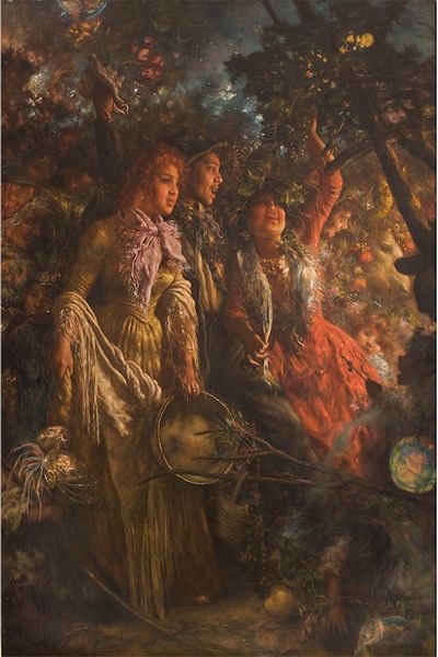 Editor: Here we have "Going to Market," an 1860 oil painting by John Lee. It has a fairytale-like quality to it. The two children and donkey in the painting have a rather dreamlike appearance against the somewhat drab backdrop of rural England. How do you interpret this work? Curator: I see in this painting a commentary on rural child labor in Victorian England. Consider the children's weary expressions and their attire. What does their clothing say about social class? Editor: Their clothes are simple and worn, indicating they’re from a lower economic class, perhaps? Curator: Exactly. Lee isn't simply depicting a pleasant genre scene. By including children performing labor, he subtly critiques the socio-economic structures that necessitated their involvement in the market economy. This was a period of great social change and industrial expansion; Lee’s Romantic style highlights the emotional and social costs behind the rise of industrial society. The slight griminess may challenge the rosy view held of "Merry Old England." Notice the girl is centered on the donkey. Does this raise a discussion point about female participation in economic activity? Editor: That's something I hadn't considered. It challenges assumptions about gender roles. Was Lee suggesting that young girls were already contributing to the market, just like men? Curator: Precisely. By subtly highlighting the work undertaken by women and children, Lee calls attention to broader economic inequalities that impacted marginalized groups in British society during the mid-19th century. Also, what do we think the chicken signifies in her arms? Editor: Thinking about how gender, work, and nature converge reveals complex themes within this piece. Curator: Indeed, art can show the connections between different aspects of the human condition. The everyday activity that the artist is depicting is tied to social criticism.